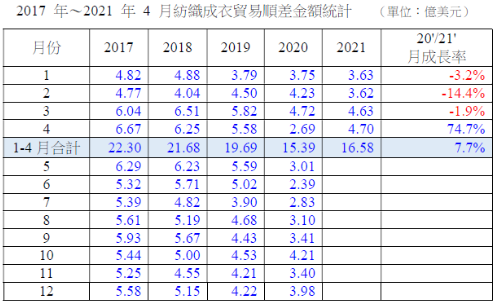 2021年4月中国台湾地区纺织成衣产品贸易顺差(=出口金额-进口金额)金额4.70亿美元,较2020年4月的2.69亿美元大幅成长74.7%;2021年1-4月中国台湾地区纺织成衣贸易顺差金额合计16.58亿美元,较前一年同期的15.39亿美元成长7.7%。