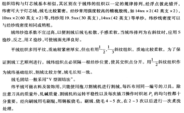 织制经平绒时,因为单层起毛杆织制法的生产效率低,所以,一般都用双层织制法。平绒织物与灯芯绒织物的性能相似,只是形成绒毛的系统及特征不相同。