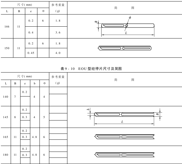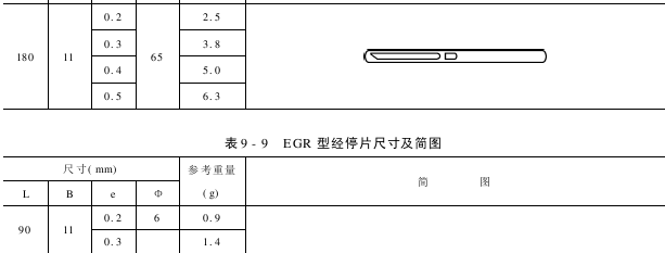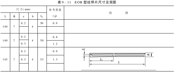 无梭织机大多用电器式经停片,其型号有EGU型、EOU型、EGR型、EOR型尺寸及简图见表9-8~表9-22,其标记代号示意如下: