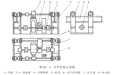 (2)行车:行车是织物精练过程中的运行构件,它主要由导轮、绳轮、变速箱、轨道、行车架和电气操纵系统组成,见图10-3。