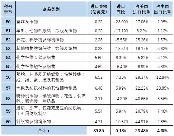 按照ITC口径,涉及加税的HS50-60章对美国2017年出口金额如下: