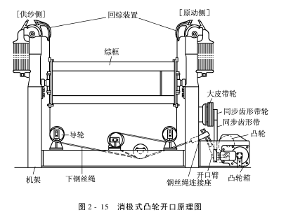 在图2-15中,当凸轮由小半径转到大半径时,通过转子和开口臂将连接在综框上的钢丝绳向右拉动使综框从高点运动到低点;同时回综弹簧受力伸长储蓄能量。当开口凸轮继续转动从大半径转向小半径时,整个回综系统则靠回综弹簧储蓄的能量使综框回复到原位,即从低到高。
