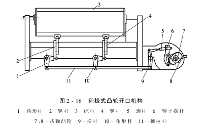 (1)消极式凸轮开口机构:由于凸轮轮廓面形状可以按照开口工艺进行设计,所以凸轮开口机构的运动性质可以弥补连杆开口机构运动性质难以改变的不足,拓展了织物的适应性。它不仅能织制平纹、斜纹和缎纹,而且可以织造灯芯绒及某些复合组织的织物。因此是用户广泛采用的开口型式(图2-15)。