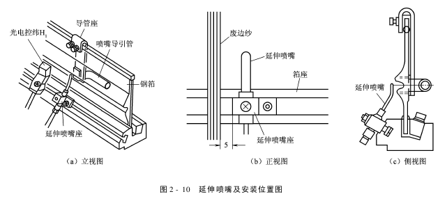 (4)延伸喷嘴:延伸喷嘴也叫牵伸喷嘴,安装在末一只辅助喷嘴之后,位于布幅之外。延伸喷嘴的结构与辅助喷嘴相似,供气时间长,可牵引纬纱伸直。当主、辅喷嘴先后关闭后,延伸喷嘴仍继续保证喷射,以免在综平前纬纱反弹。用于防止纬纱反弹产生纬缩等,多用于纬纱为强捻长丝或包芯纱等场合。采用较高的气压会增加织机气耗量(图2-10)。