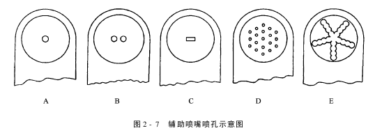 由于各种辅助喷嘴在其气流进口处的管径、管子长度、压扁形状、孔数及孔径等都存在着差异,在供气压力相同的条件下,各种辅助喷嘴的出口风速不尽相同。在生产中,单孔和多孔都得到了广泛的使用。日本津田驹系列采用单孔辅助喷嘴、丰田JA采用双孔,而欧洲各国多采用多孔的辅助喷嘴。辅助喷嘴喷孔示意图见图2-7。