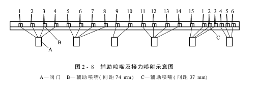 辅助喷嘴在筘座上的分布如图2-8所示,一般情况下,辅助喷嘴以5个为一组,也有2个、3个或4个为一组,每组喷嘴受控于一个电磁阀。因此,同组几个辅助喷嘴的开闭时间是一样的。辅助喷嘴数与筘幅有关,各组喷嘴喷射时间互相衔接,各喷嘴间距通常为60~80mm,标准设定80mm。