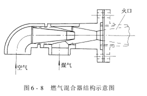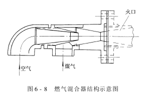 (2)气体混合装置:燃气混合器的结构如图6-8所示。可燃性气体和空气只有在适当的混合比例下才能完全燃烧,从而获得较高的温度。由于空气进口管口径大,出口管口径小,在出口处形成很高的气流,在其四周空间出现负压,把煤气按比例吸入混合,进入扩散管。扩散管的口径是逐渐增大的,混合气的流速逐渐降低,使混合气有肯定的扩散混合时间,提高混合程度。