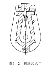 ①有火焰式火口:狭缝式火口是一用铸铁做成的狭长形小箱,其截面形状如图6-2所示。箱内是可燃性气体和空气的混合室。小箱上部有一条狭缝,是混合气体喷燃口。狭缝的长度和火口的长度基本一致。为了不浪费可燃性气体,火口两端可用压板或高压空气进行调幅,使火焰喷射宽度适应烧毛织物的宽度。