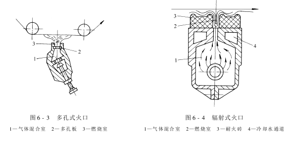 火口的种类很多,主要有有火焰式、辐射和火焰混合式、完全燃烧火焰式、无焰式等。有火焰式火口又有狭缝式和多孔式之分,其中,以狭缝式火口使用广泛。