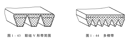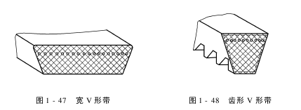 如图1-48。齿形V形带承载层为绳芯结构,内表面制成均布横向齿的V形带。它散热性好,与轮槽粘附性好,是曲挠性好的V形带。