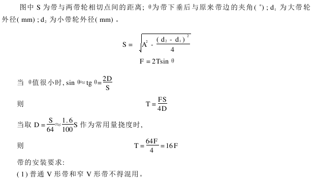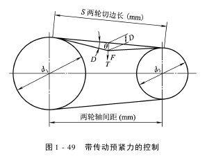 测量张力的方法:在带与两带轮的切点间的长度S中点处施加一垂直于带的压力F,使其产生挠度D,如图1-49所示,就可得出带的张力T,这些因素之间的关系式如下: