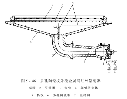 ②在多孔陶瓷板外覆金属网红外辐射器中,煤气和空气的混合气从气流挡板和辐射器壳间的间隙喷向多孔陶瓷板,混合气在多孔陶瓷板和金属网间燃烧形成红外辐射。