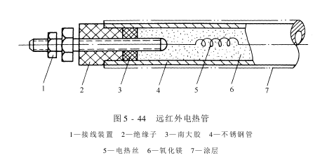 织物在烘燥、上色、固色过程中,主要依靠汲取λ为4~5μm的中红外线,辐射体表面相应温度为550℃。产生此类红外线的远红外电热管结构如图5-44。其大优点是耗电少,可比一般电热式红外辐射器节电30.5%。