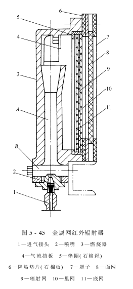 ①金属网辐射器的工作过程是,当肯定压力的煤气经喷嘴压入燃烧器的引射器A时,煤气引射器内高速流体,使孔A内压力降,自动将空气从燃烧器的孔B吸入,煤气和空气的混合气体沿引射器逐步得到均匀的速度和浓度,继续前进,在和燃烧器内壁气流挡板撞击后喷射至整个燃烧器内部空间,在里网和面网之间燃烧,使面网、辐射网、里网的温度急剧上升,赤热的面网、辐射网、里网和它们的高温烟气都发射出红外线。在正常情况下,一个合格的辐射器,在标准煤气压力下,点燃后应燃烧稳定,没有火焰,里外网赤红,且亮度均匀,无噪声。由于铁铬铝的膨胀系数很大,为了预防辐射网在赤红时变形,预先将它冲压成波纹形状。