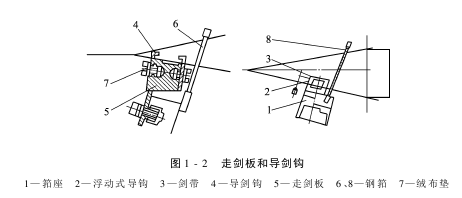 导向器件有导剑钩和导向走剑板(绒布垫)等,对于窄的剑带(16mm)两侧均使用导剑钩,较宽的剑带(24~30mm)往往仅靠织口的一侧有导剑钩。有的织机无导剑钩。剑带在梭口中的导向器件起到两方面的作用,一是稳定剑头和剑带在梭口中的运动;二是托起剑带,减少剑头、剑带与经纱的摩擦。有的织机为减少剑带与经纱的摩擦,将导剑钩做成浮动式导钩,稍稍托起剑带,“浮”在下层经纱之上约1~3mm。如图1-2所示。