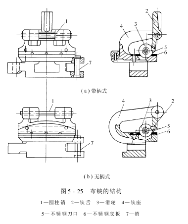 布铗的工作原理如图5-28(a)所示。在布铗链的进布端,由于布铗链轮上方的开铗转盘的作用,将绕经转盘的有柄布铗打开,使织物的边部进入其间。在布铗离开转盘时,由于滑轮(图5-25)被织物边部托住,不能落入底板的轮槽中,刀口并未夹住织物。待布铗沿该段轨道的开档逐渐加大而使织物边缘外移至肯定位置时,滑轮落至底板轮槽中,刀口触及织物边部,并将它夹住,从而使铗持宽度均匀。出布端织物脱铗时,也是采纳同样方法,打开铗舌。无柄布铗则是采纳酚醛层压板制的开铗板来打开铗舌的,见图5-28(b)。