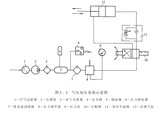 空气经过空气过滤器滤去尘埃,进入压缩泵加压。通过水气分别器将清洁干燥的压缩空气储存在储气桶中。桶上装有安全阀,以预防桶内压力过大而发生爆炸。储气桶中的压缩空气经雾化油润滑器,和雾化油混合,再经压力调节器、分配阀、单向节流阀进入气缸,推动活塞加压于轧辊。
