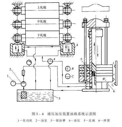 采纳液压加压装置,克服了杠杆加压的缺点。图3-4所示为液压加压装置的油路系统示意图,其工作原理是由原动机传动油泵,将油自油槽压入油缸,再经三相阀和并联管道分别输送至下轧辊两端轴承下方的油缸内推动活塞,顶起下、中两轧辊压向位置固定的上轧辊,完成加压。