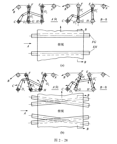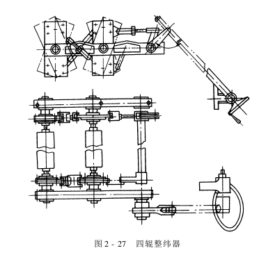 图2-27所示的四辊整纬器是目前国内使用较为普遍的一种。它主要由四根整纬辊和调节机构组成。各整纬辊之间分别依靠双列向心球面球轴承和两组连杆相连。