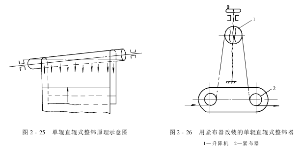 认真分析织物在全幅内经向张力的变化情况,可以进一步了解整纬的物理过程。当整纬辊水平放置时,即和织物纬向平行,经向张力在织物全幅内的分布是均匀的,各经纱的相对运行速度也一致;当整纬辊出现歪斜,如右端高于左端时,织物的经向张力就产生了从右至左的递减,如图2-25所示。织物和辊面的摩擦阻力也发生同样的递减。于是,织物经纱的运行速度发生从右至左递增,即整纬辊左端的经纱速度大,右端的速度小。和经纱相交的纬纱也就出现右端变慢、左端加快的现象。这样,左后直线型纬斜就得到了改正。图2-26是利用紧布器改装的一种单辊直辊式整纬器。它结构简单,效果颇佳,但只能调整3°以内的直线纬斜。