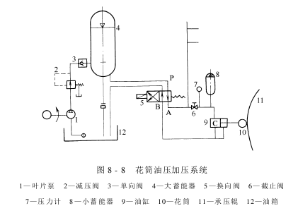 d.油压加压机构:如图8-8所示为花筒油压加压系统。由叶片泵输出的中压级压力油,经减压阀和单向阀,进入大蓄能器油箱。当换向阀处于加压位置时,压力油经PA通道分别进入输向各花筒加压油缸的油路。印花时,开启截止阀,压力油进入小蓄能器和油缸C室,使花筒压向承压辊,当压力达到所需值时,关闭截止阀,油缸的工作不受其他油路的影响,并因小蓄能器的作用而稳压。卸压时,先开启截止阀,再将换向阀转至卸压位置,则油缸中的压力油回流入油箱,油缸活塞杆将花筒拉离承压辊。