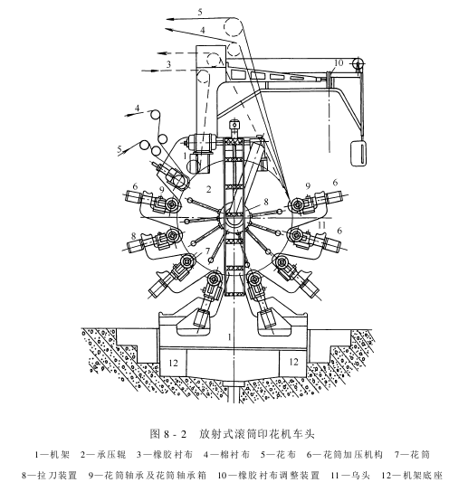 印花车头是滚筒印花联合机的核心部分,主要由机架、花筒、承压滚筒(也叫承压辊)、加压机构、给浆装置、对花装置及传动装置等组成,如图8-2所示。习惯上把进布喂入点的一面称后车,出布一面称前车。