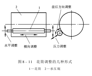 花筒的调整形式如图8-22所示,包括压力调整、水平调整、横向调整和前后(按织物经向运行方向)方向调整等。后三种形式的调整确定了花筒的空间位置,直接影响对花精度。