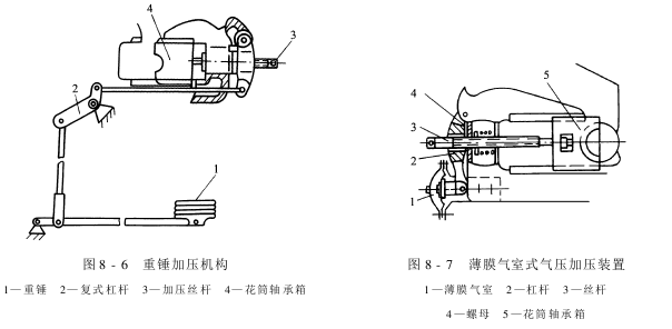 c.气体加压机构:图8-7所示是薄膜气室式气压加压装置。它是用压缩空气直接作用于气膜,经一级杠杆放大压力,由丝杆加压于花筒轴承上实现的。此机构结构简单,但仍需要转动丝杆调节花筒压力,故很少使用。