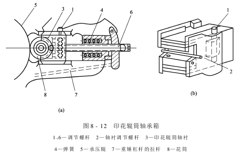 (4)花筒加压机构:加压机构通过花筒轴两端轴承对花筒施加压力。为了使印制图案清晰,左右印浆均匀,施加压力大小必须适当,施压太轻,印出的图案颜色就浅,甚至露底,太重则会模糊失真,还会额外地增加动力损耗,加剧零件磨损。通常粗线条、大花纹的花筒和作为光版的压辊用轻压,细线条、云纹和雪花的花筒用重压。线压力范围为100~600N/cm,常用200~400N/cm。随花筒长度的不同,每只花筒的总压力可达2×104~8×104N。此外,加压机构还应满足如下工艺和操作要求: