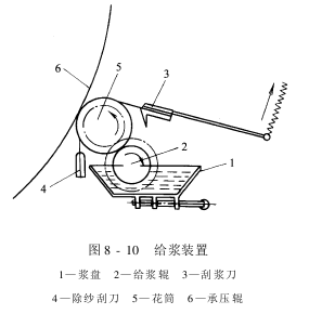 (5)给浆装置:给浆装置由浆盘、给浆辊、刮浆刀和除纱刮刀等组成,如图8-10所示。每只花筒配备一套给浆装置。