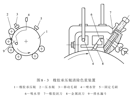 为节约工业用布,降低消耗,现在除1600型印花机外,大都使用橡胶承压辊代替“三布”印花,即采用无衬布印花。橡胶承压辊胶层厚10~15mm,硬度为HSA94~96。要求胶面平整、耐压和耐化学腐蚀。橡胶承压辊易被渗透的色浆沾污,用橡胶承压辊直接印花,必须用如图8-3所示的洗除色浆装置清除残留在承压辊表面的色浆,避免沾污印花织物。它不适宜印制套色较多和大面积花纹的花样及稀薄织物。