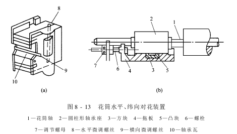 水平调整即调整花筒两端的高低位置,使花筒达到水平,俗称上下对花。它通过旋转花筒轴承座水平调节螺杆,使轴瓦(或滚动轴承套筒)上下移动,使花筒水平微调完成对花,如图8-13(a)所示。