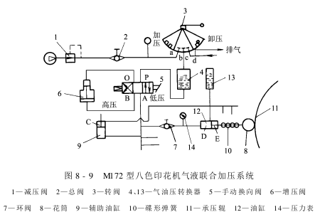 e.气液联合加压机构:M172型八色印花机采用气液联合加压系统,加压原理如图8-9所示。加压时,600~700kPa的压缩空气经减压阀、总阀,进入转阀向气、油压转换器中的油施压,加压的油经手动换向阀输向各号花筒,此时,转阀处于加压位置,油路a、b接通,完成加压。当手动换向阀处于低压位置时,PA接通,压力油经环阀进入油缸的D室,向花筒加压;换向阀处于高压位置时,PB接通,压力油进入增压器的下部,增压后由上部输出,经换向阀的OA油路和环阀进入油缸的D室,向花筒加压。当花筒的左右压力达到所需值时,关闭环阀,使加压油路稳定。卸压时,将转阀转至卸压位置,此时,a与c、b与d分别接通,压缩空气将气油压转换器中的油压进辅助油缸的C室,通过OA油路使增压器的活塞下降复位,再开启环阀,将手动换向阀置于低压位置,气油压转换器中的油进入油缸的E室,使D室的油返回气油压转换器中,油压降为零,花筒卸压。