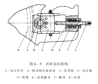 a.丝杆加压:老式印花机的首末两号花筒常用丝杆加压,结构如图8-5所示。由于套筒螺母用滑键定位在机架上不能转动,旋动丝杆加压时,使花筒表面与承压辊表面相压。当压力逐渐增大时,螺母受反力向后退,使套在螺母后的弹簧受压,从而借弹簧的弹力通过套筒螺母和调节丝杆加压于花筒。弹簧在印花时能起到缓冲作用,压力的大小决定于弹簧压缩力,花筒卸压时将丝杆反转即可。