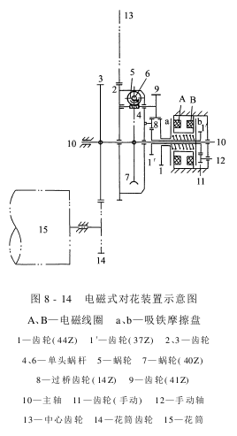 正常运转时,电磁铁A、电磁铁B不通电,主轴10上的各齿轮的转速相等。需要对花时,按下按钮,电磁铁A或电磁铁B通电,吸住摩擦盘a或摩擦盘b,使齿轮1或1′停转,齿轮9转动或反转,通过周转轮系,使齿轮3和花筒齿轮14获得一个附加转速(增大或减少),从而使花筒与织物产生相对位移,达到前后对花的目的。位移大小与按钮的时间长短成正比。