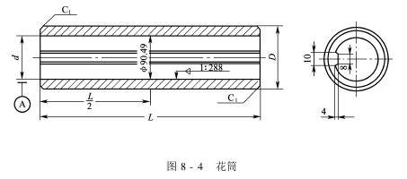 花筒的结构如图8-4所示。花筒内孔为锥孔,锥度为1∶288,与相应锥度的花筒轴匹配,花筒内孔有凸形长键,轴上有凹形键槽,两者紧密配合,以保证相对稳定。花筒轴用45 钢制成。