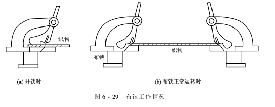 当织物进入布铗链时,借开铗盘的推力使铗舌刀口和铗身的不锈钢薄片之间形成空隙,织物布边即喂入布铗,如图6-29(a)所示。此时铗舌靠自身重量落在布上,触片即被织物托住,铗舌刀片尚未咬住织物。由于布铗链间的距离逐渐增大,织物渐渐离开触片,当织物离开到槽沟外时,铗舌又靠自身重量下落,触片落于铗身平面的槽沟内,由于织物的纬向张力和摩擦力的自锁作用,刀口即将织物布边咬住,从而使织物得以在纬向获得扩幅,如图6-29(b)所示。