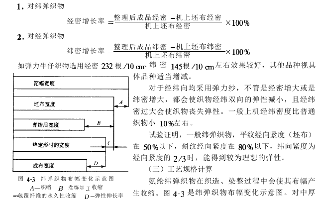 密度的设计和织物在各整理工序中的收缩有关。但影响收缩的因素颇为复杂,和外包纤维的种类、纺纱线线密度、纺纱线捻系数、织物组织、结构以及各道工序的工艺参变数均有关。