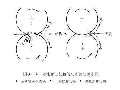 上述几种轧水机都是依靠轧车的轧压作用,把水分从织物中排除。这种轧压作用能排除的大部分是织物表面的水分,至于纤维或纱线空隙中的水分,则只能排除小部分。因此,单纯靠增大轧点压强来降低轧余率是有限度的。为了进一步提高轧水效率,出现了使用吸或吹的方法来排除更多水分的新型轧辊和轧车,这就是微孔弹性轧辊和压缩空气喷射式轧车。