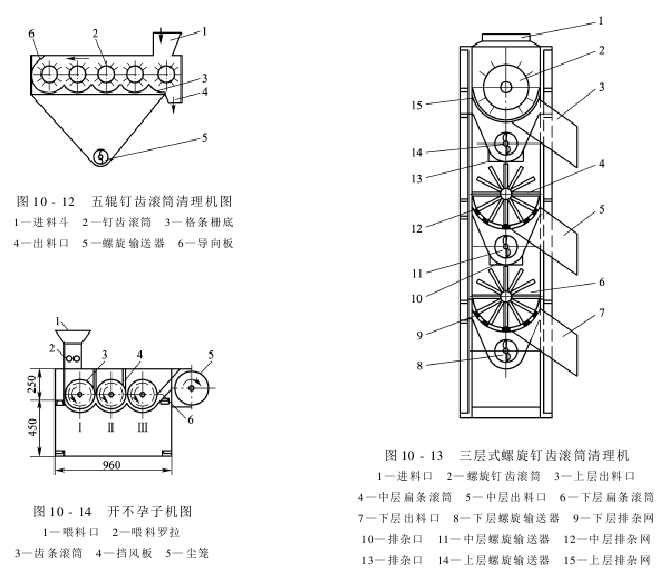 五辊钉齿滚筒清理机是连续化清理不孕子的设备,如图10-12所示。