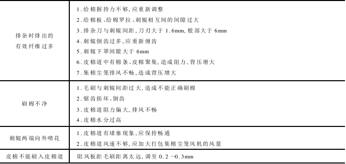 (8)尘笼内外、排杂刀等部位,每班清扫一次,预防挂花。1~2周打开防护罩,清理飞绒一次。每周清理一次刺辊上的棉子和棉纤维。
