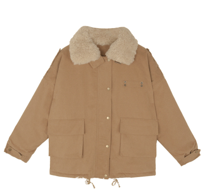 很喜欢这种工装风格的棉衣,咩有气鼓鼓的感觉,穿上暖和又显瘦。连帽大毛领样式,时尚流行,前面四个大口袋装饰,时尚个性,不显单调。