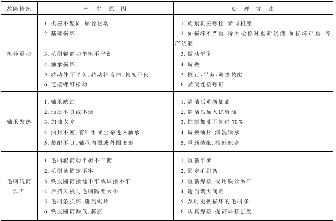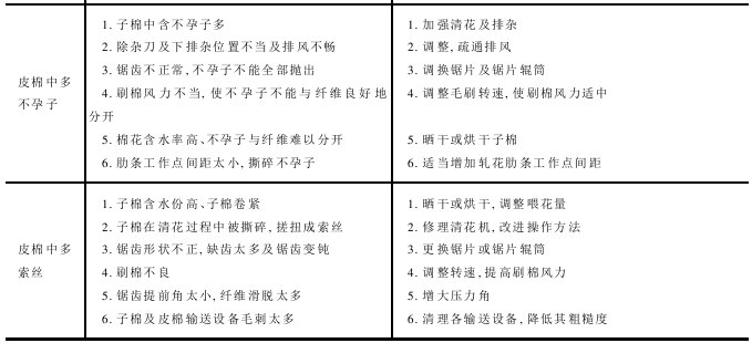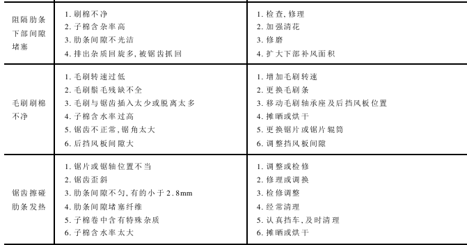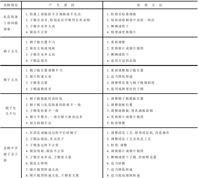 锯齿轧花工艺的常见故障可分为生产性故障和机械性故障两类。生产性故障指影响产量和质量的故障,机械性故障是阻碍机器正常运转的故障。锯齿轧花机常见故障的原因及处理方法见表8-7。