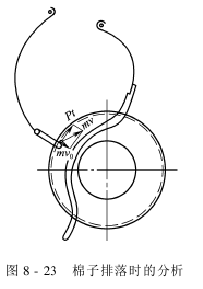 和锯片侧面直接接触的这部分棉子和锯片之间产生摩擦力P,P的方向沿接触点锯片的切线方向。锯片侧面对棉子的摩擦作用转化为棉子受到的冲量,如图8-23所示。在锯片滚筒转速不变的条件下,冲量的大小取决于棉子和锯片接触的情况。当棉子含有较多的纤维时,摩擦力冲量较大,反之,较小。