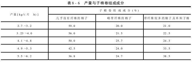 单粒子棉上的纤维经过一次锯齿勾拉肯定不能拉完,即单粒子棉的轧剥过程都是在肯定时间间隔内完成的,故工作箱内的子棉卷由处于不同轧剥阶段的单粒子棉组成。但子棉卷的组成也不是固定不变的,处于不同轧剥阶段的子棉群比例和轧花机的操作过程(非常是喂花速度)有关。改变喂花速度会改变子棉卷组成成分的比例及其他参数,如子棉卷转速、子棉卷重量、子棉卷密度等。从表8-6可以看出:子棉卷中轧净纤维的棉子数量,随轧花机生产率的提高有规律地减少;单粒子棉和带纤维多的棉子,则随轧花机生产率的提高增加了。其它工作箱内还存在着大量完全轧剥过的,应该从工作箱内排出的棉子。这些棉子滞留在工作箱内,无疑会降低轧花机的生产率。为此,有一种理论认为:减少棉子在工作箱内的逗留时间,是提高轧花机生产率的重要途径。