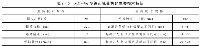 MY—96型锯齿轧花机的主要技术特征见表8-5。