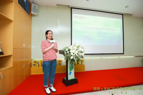 顺应生态环保的低碳的可持续理念,重新定义有机环保时尚新潮流,广东前进牛仔布有限公司一直聚焦绿色环保时尚,坚持牛仔产业的绿色低碳发展,让牛仔成为环保的面料之一。综合部经理黎瑞珊与大家分享了前进牛仔绿色工厂建设以及碳足迹的探索,借此机会传播前进牛仔决心实现“零碳”的理念和行动。