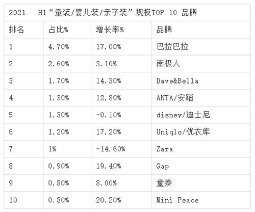 数据显示,巴拉巴拉、Dave&Bella、安踏等品牌表现依旧强势,同时多个品牌增速可观,如太平鸟旗下童装品牌Mini Peace上半年增速超20%。