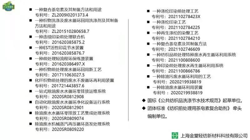 作为一家专业从事纺织印染行业绿色环保新材料研发,为纺织印染全流程提供节能减排整体解决方案的高新技术企业,上海金堂轻纺新材料科技有限公司12年技术研发积累,绿色生产,节能减排技术实力国际领先,尤其是开发的新型纺织印染前处理助剂“卜公茶皂素”系列产品与应用工艺(包含配牵装备),可帮助印染企业实现节能减排50%以上,降低传统印染企业20%—50%综合成本。