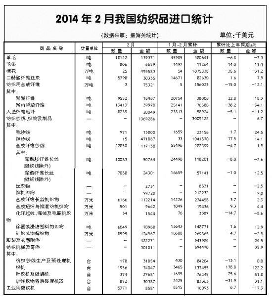 1~2月,全国纺织品累计进口增长7%、服装累计进口增长25.4%,其中,棉纱线进口增长14.1%,针织、梭织服装合计增长28.7%。